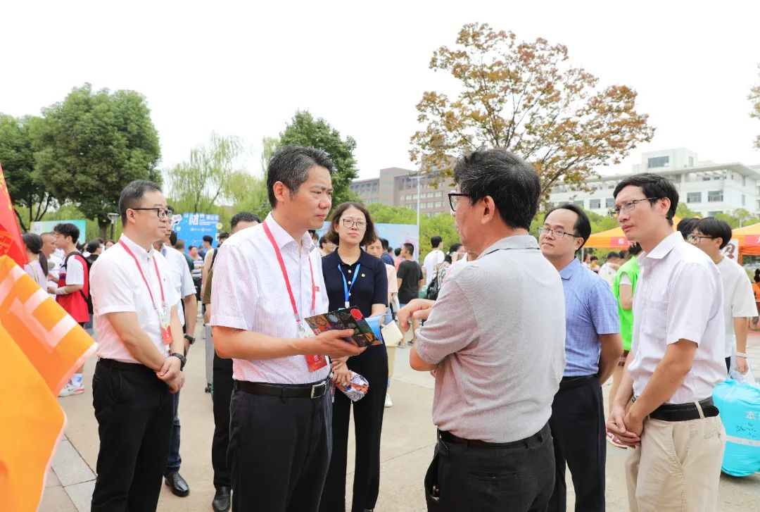 领导走访,高度重视:各级部门领导、辅导员亲临迎新现场,了解迎新流程、新生报到情况、查看新生礼包,与新生亲切交流。